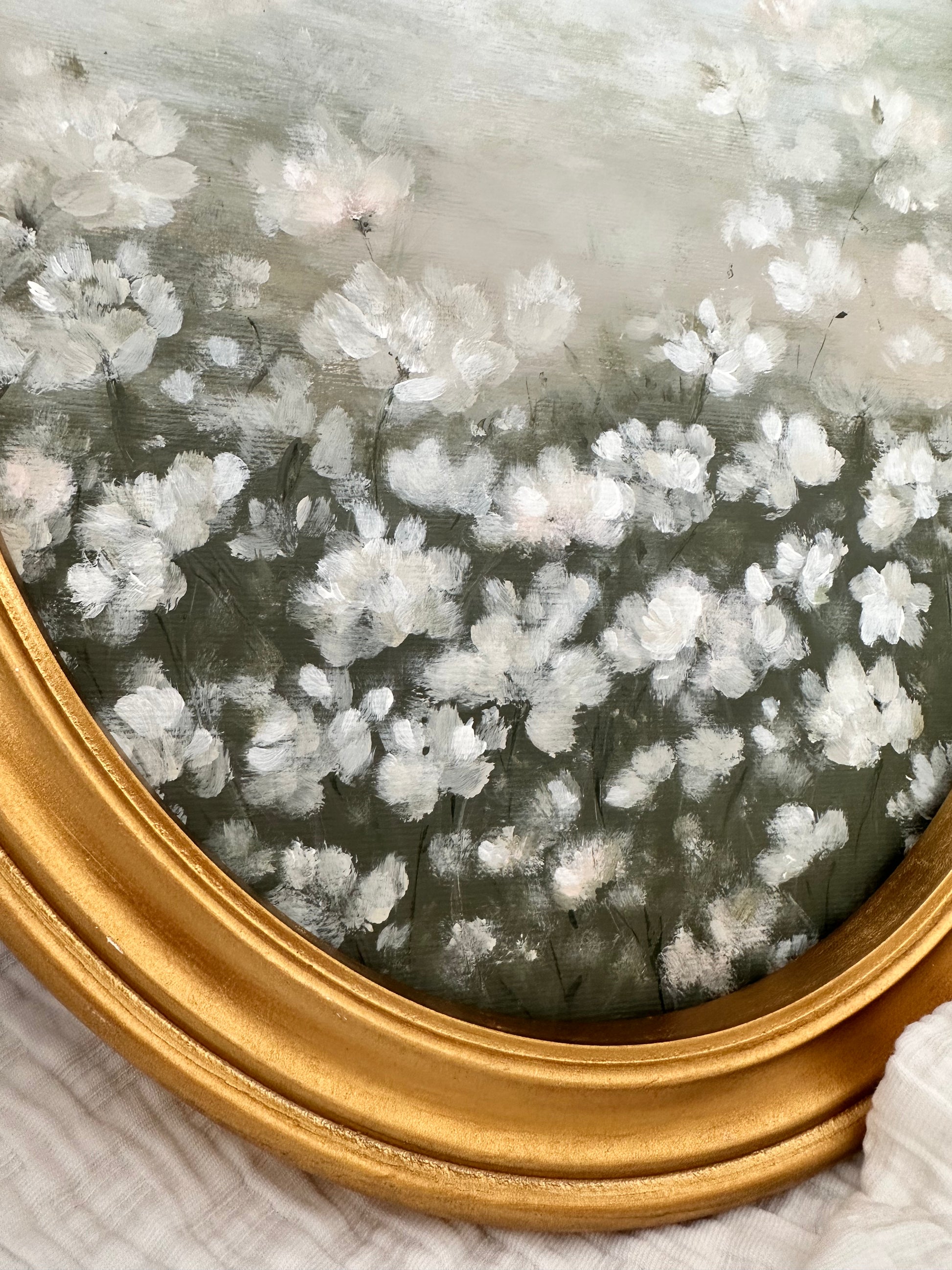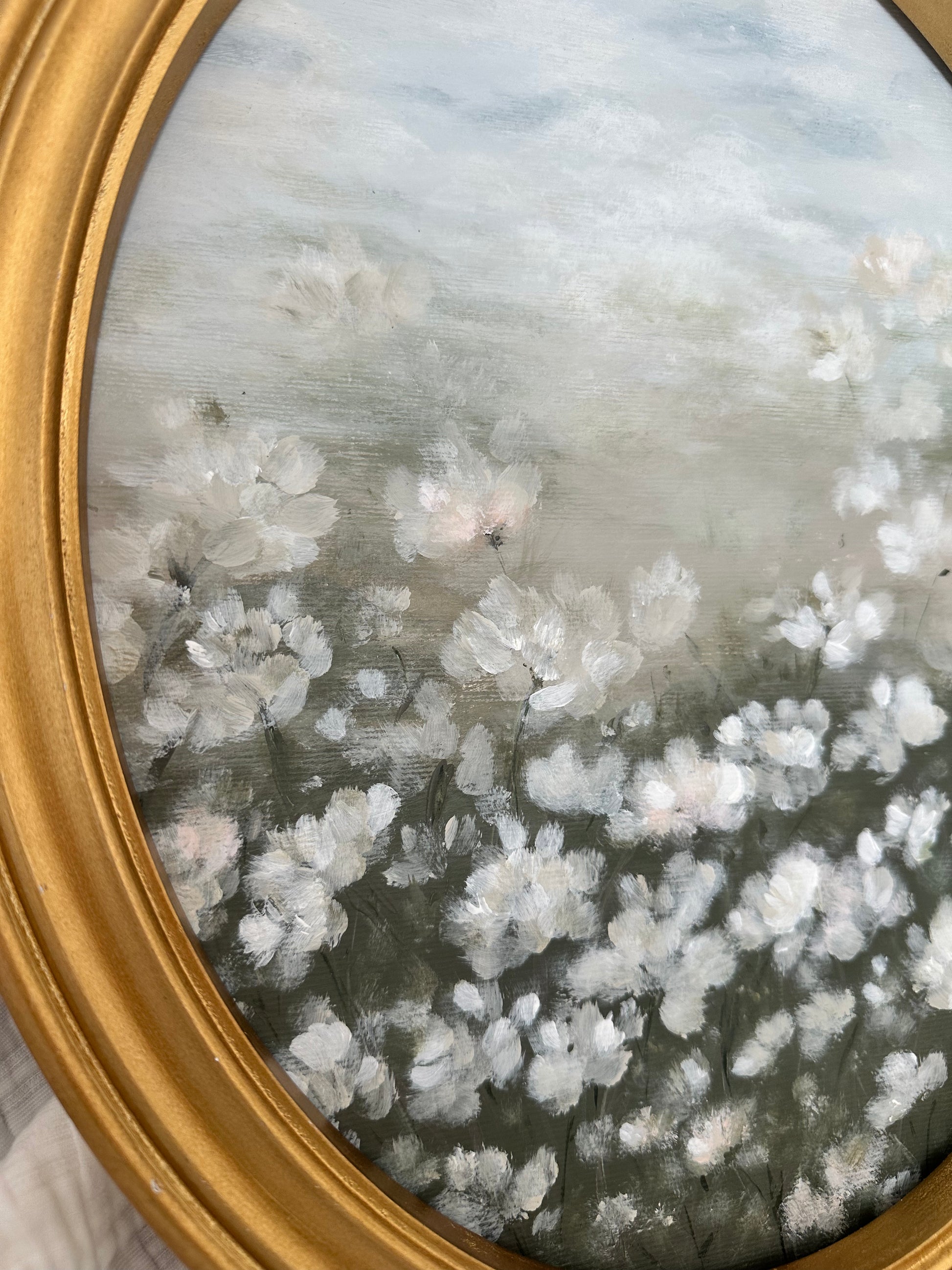 "First Whisper of Love" an 11"x14" original romantic piece in a 13"x16' oval gold frame (recommended to be hung but can lean if carefully placed)